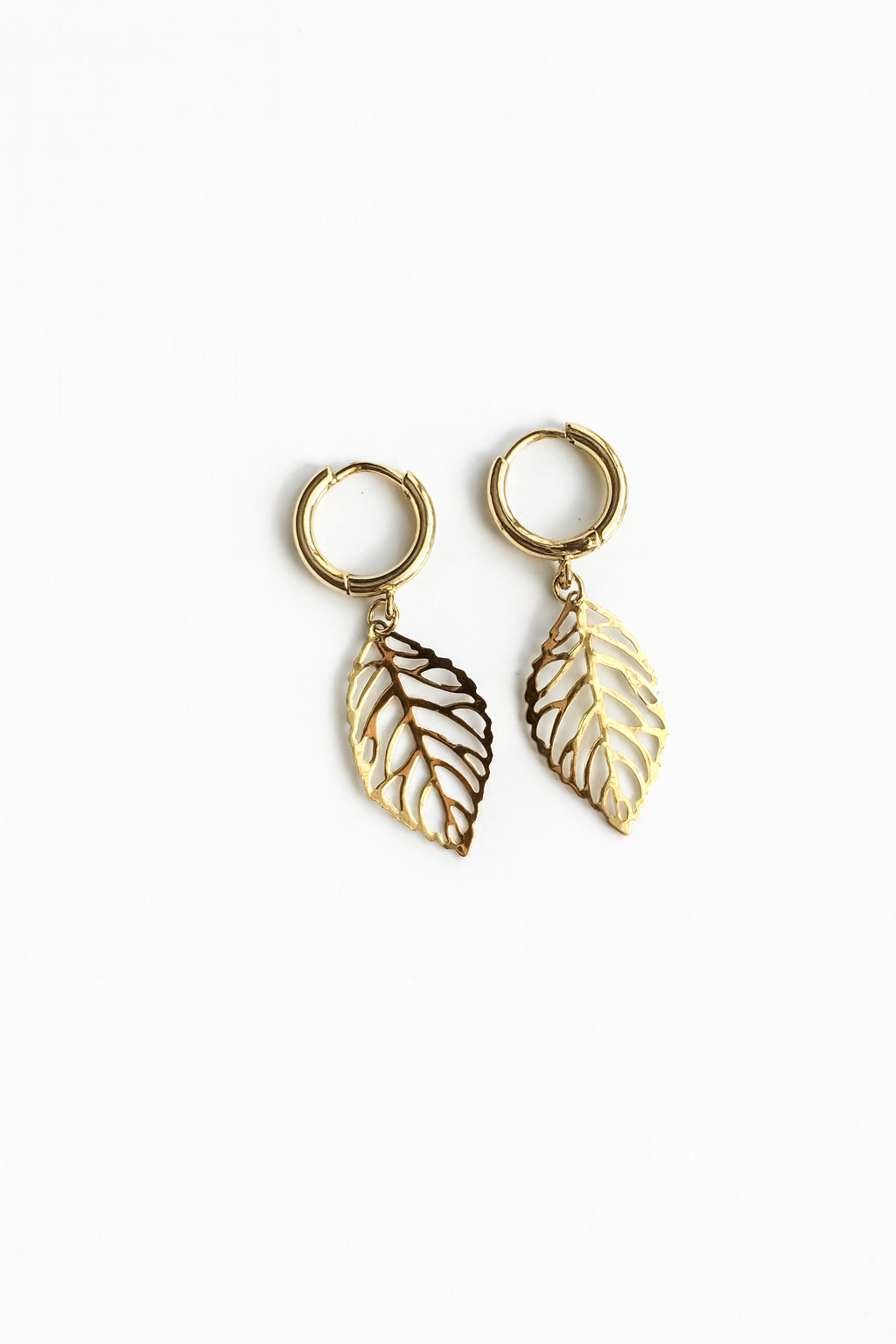 Pendientes de aro de acero inoxidable en color dorado con forma de hoja.