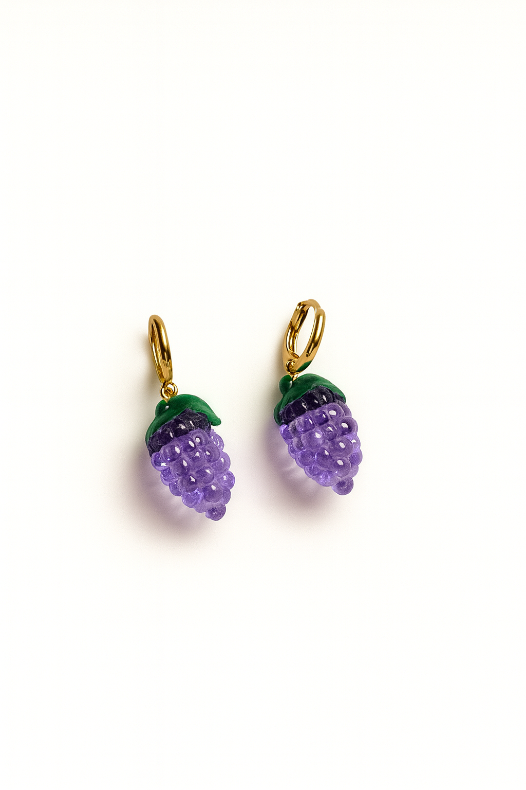 Aros de acero inoxidable en color dorado con charm de uvas.