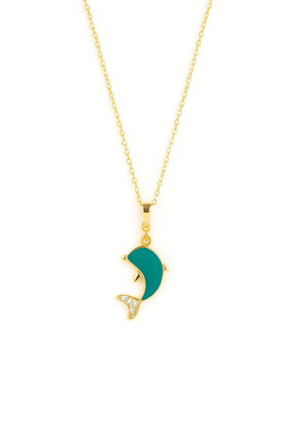 Colgante de acero inoxidable con cadena fina en color dorado. Charm de delfín con circonitas blancas y esmalte de color turquesa. Ajustable.