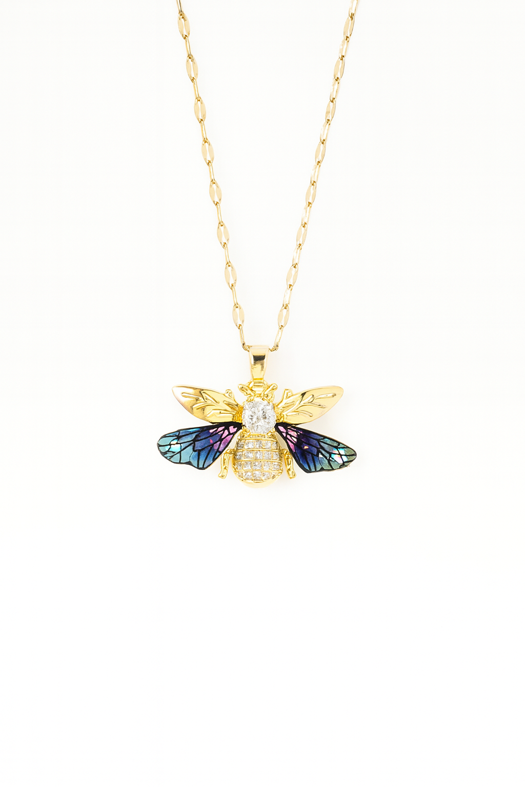 Colgante de cadena fina de acero inoxidable en color dorado con charm de abejorro de cristales de colores. Ajustable.