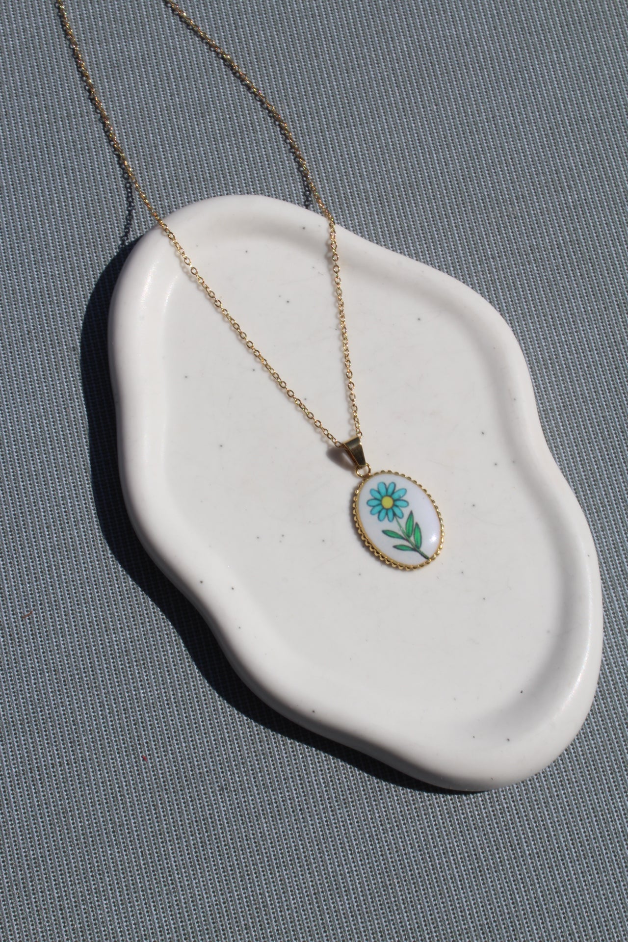 Colgante de acero inoxidable en color dorado de cadena fina con charm de flor esmaltada con forma ovalada. Ajustable.