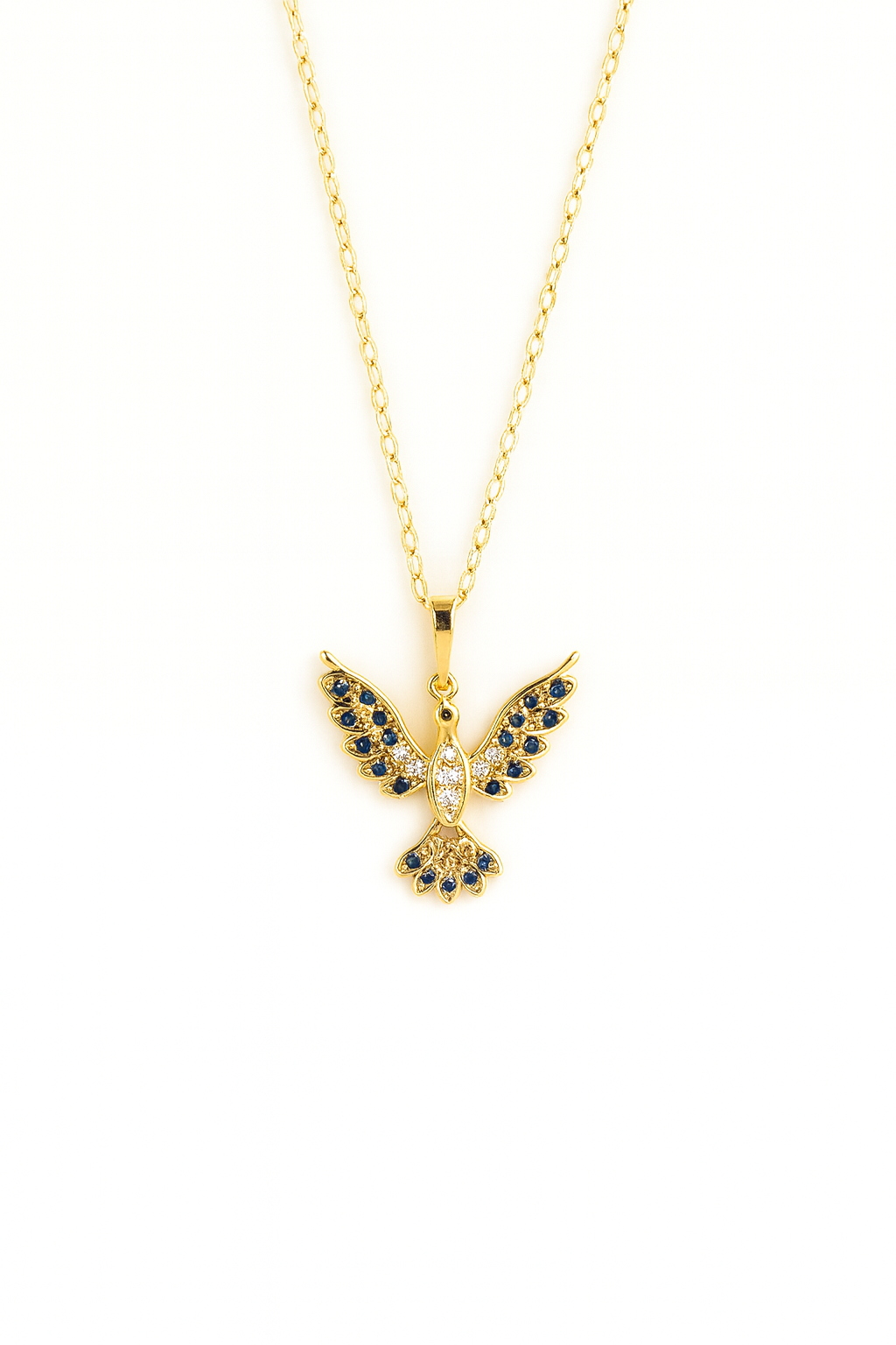 Colgante de acero inoxidable en color dorado de cadena fina con charm de pájaro alado con circonitas. Ajustable.