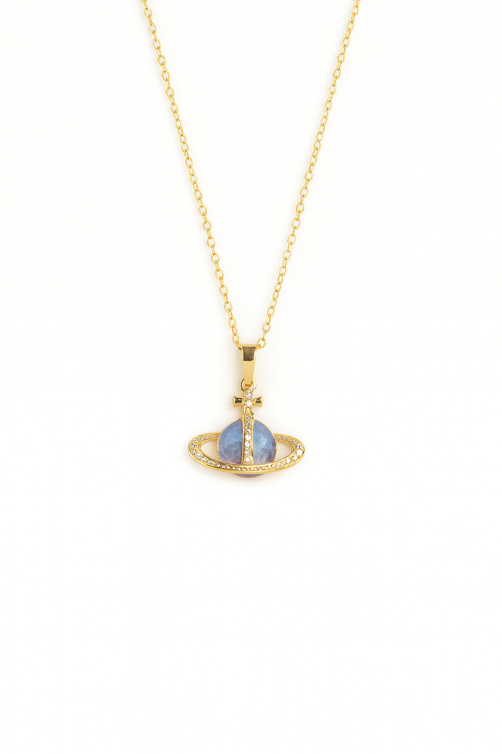 Colgante de cadena fina de acero inoxidable en color dorado con charm de planeta con cristal iridiscente. Ajustable.