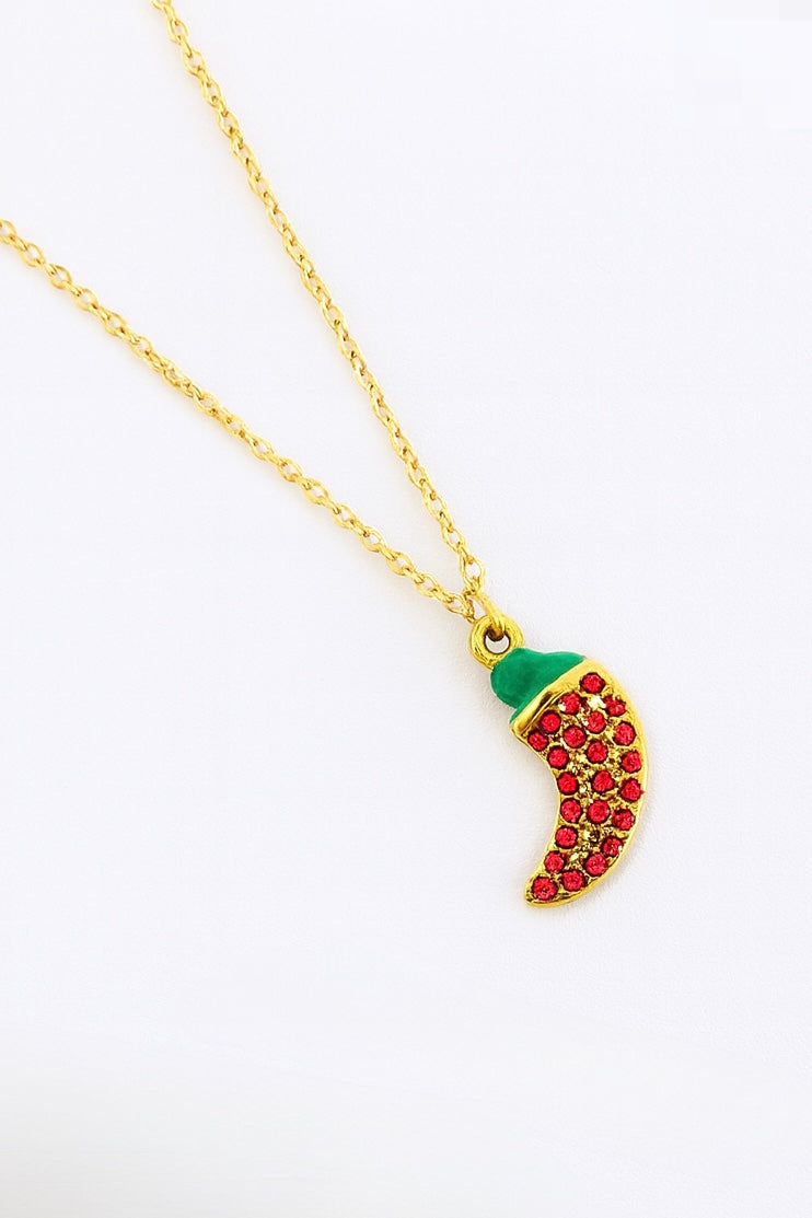 Colgante de acero inoxidable en color dorado con charm de chili lleno de circonitas. Ajustable.