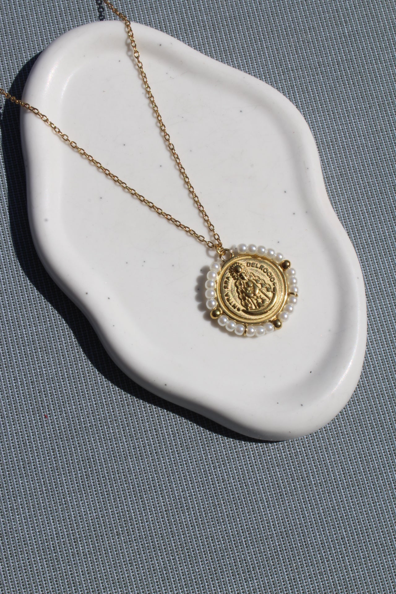 Colgante de acero inoxidable en color dorado con perlas y la imagen de la Virgen del Rocío. Ajustable.