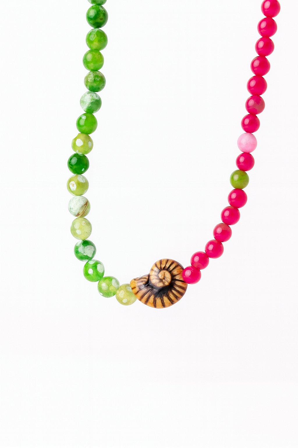 collar hecho a mano con piedras de color rosa y verde mezcladas. Charm de concha de cerámica en color marrón. Enganches dorados de acero inoxidable.