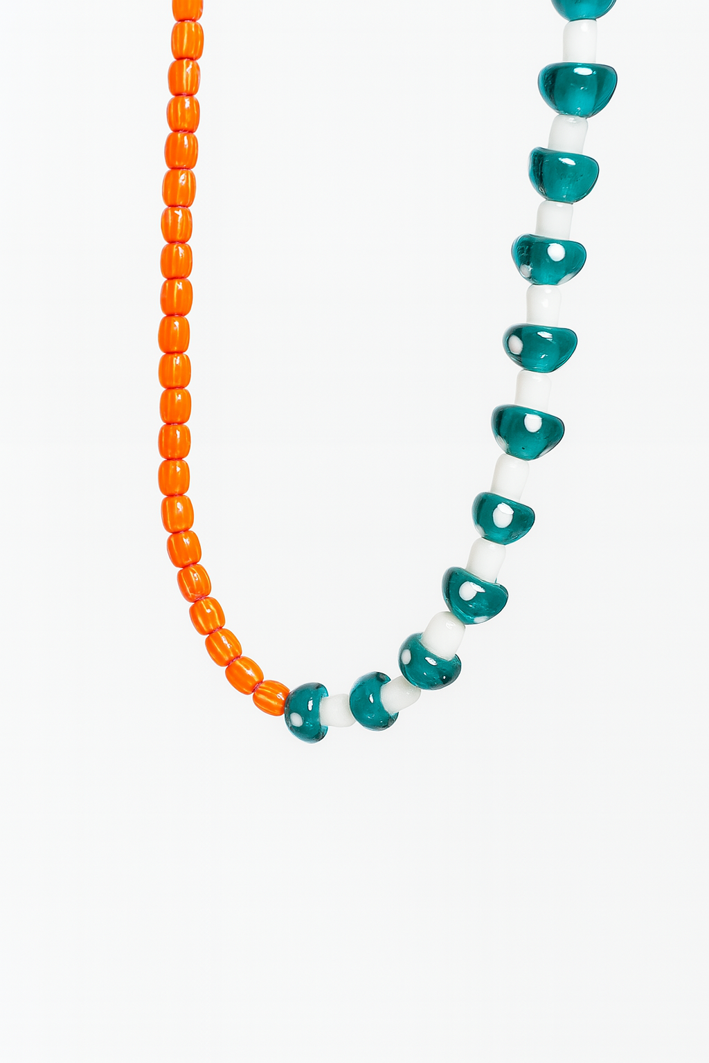 Collar hecho a mano con setas de cristal, soplado en tono verde y blanco y piedras de cerámica en color naranja. Enganches dorados de acero inoxidable.