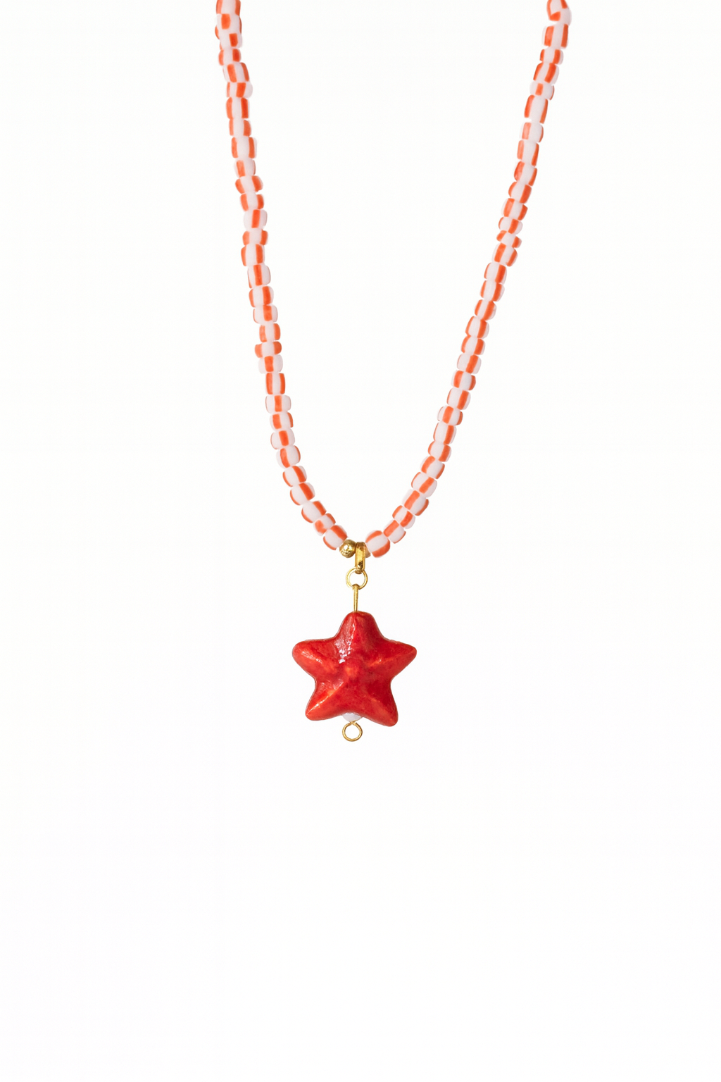 Collar hecho a mano con cuentas blancas y rojas y charm de estrella de mar de cerámica con perlita blancas. Enganches de acero inoxidable en color dorado.