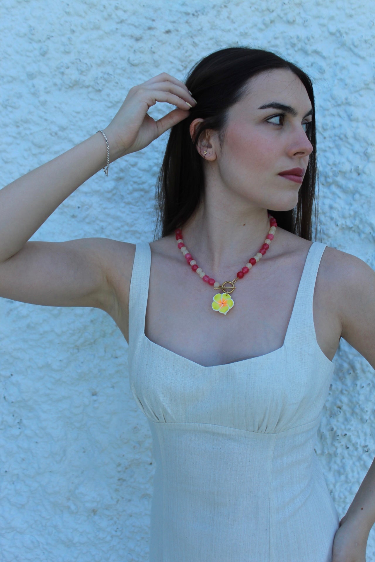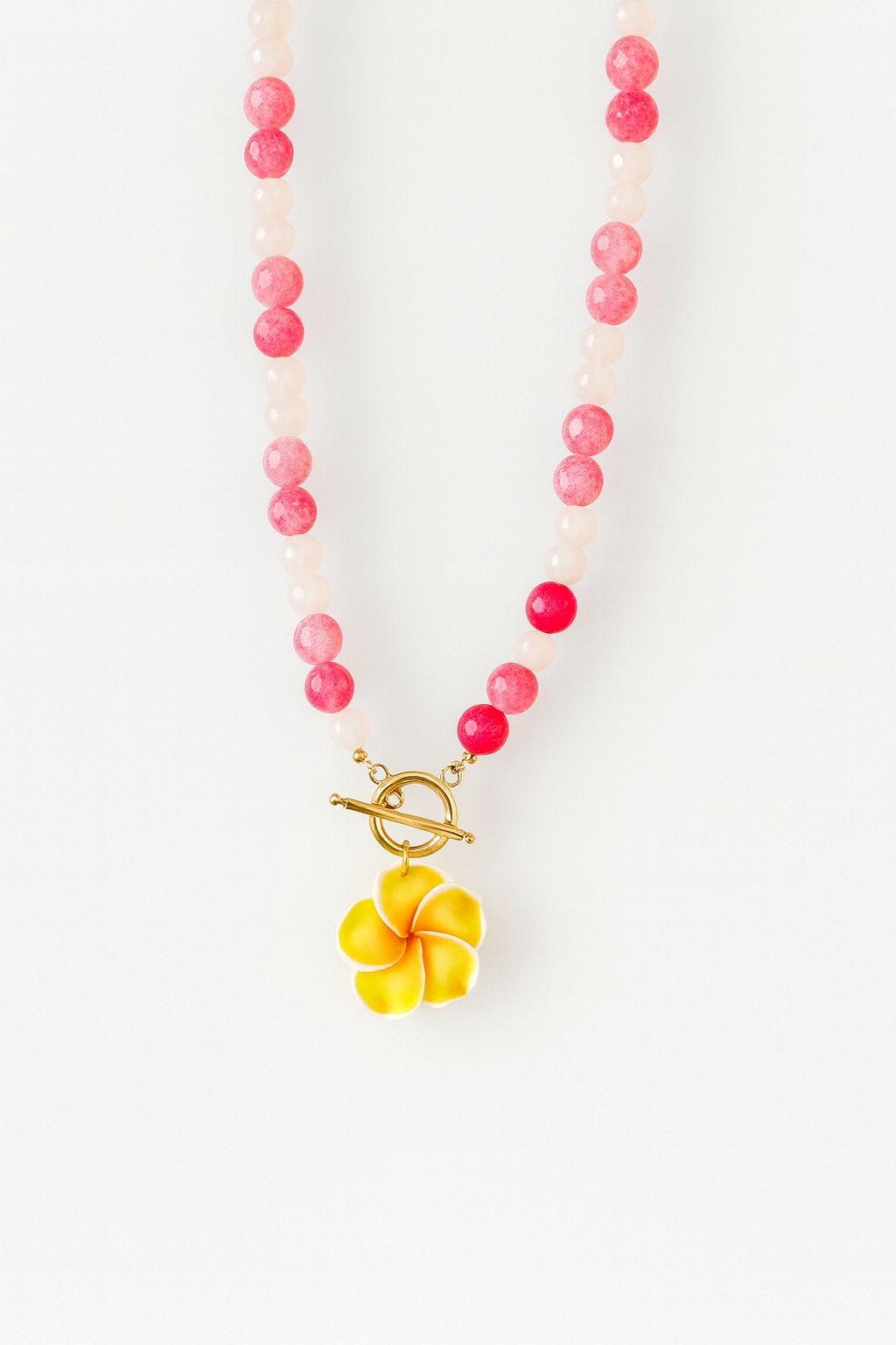 Collar hecho a mano con cuentas de piedra de color rosa y amarillas pastel. Charm de flor hawaiana de color amarillo con el centro naranja. Enganches dorados de acero inoxidable.