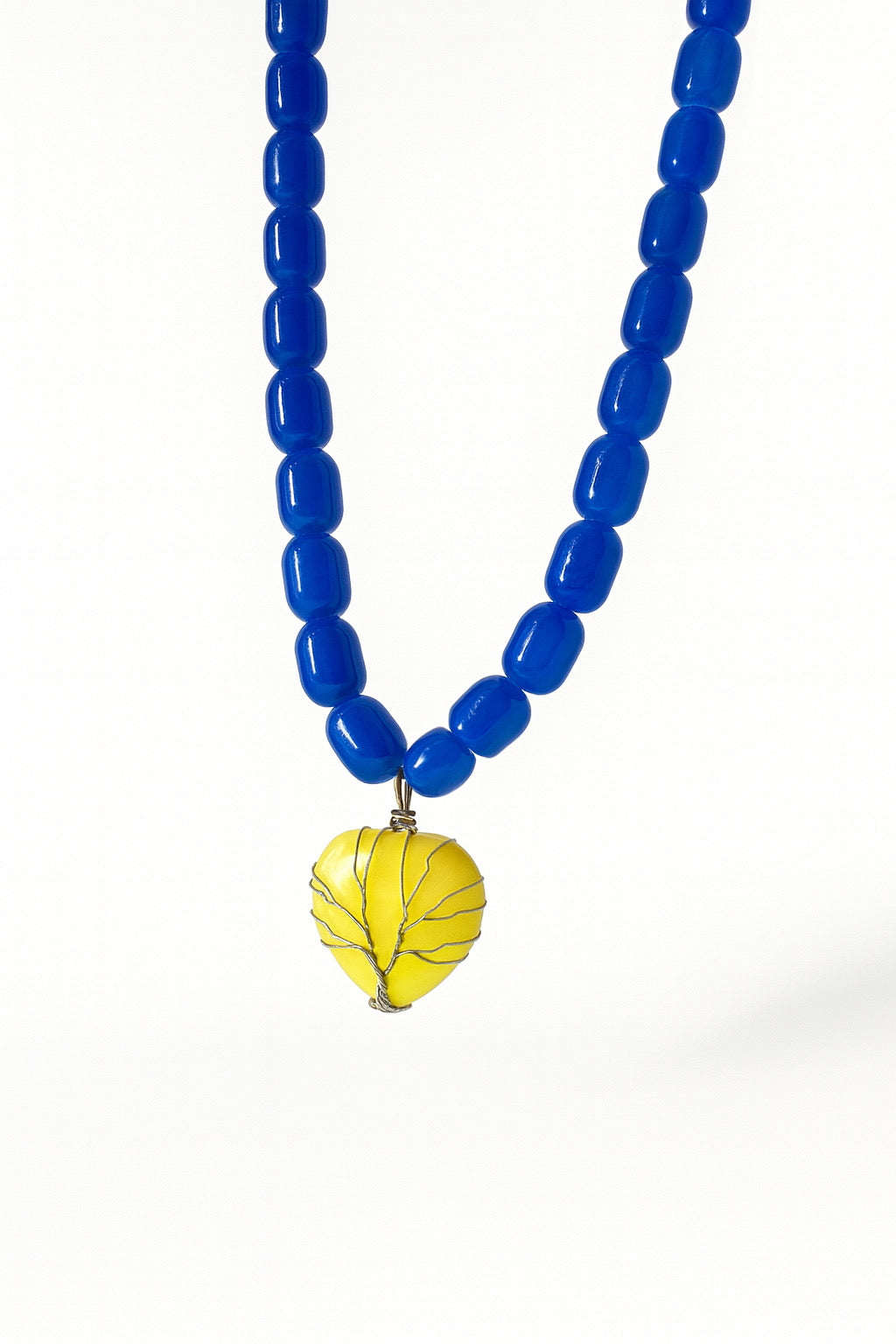 Collar hecho a mano con cuentas de color azul, eléctrico y corazón amarillo claro que brilla en la oscuridad. Enganches de acero inoxidable en dorado.