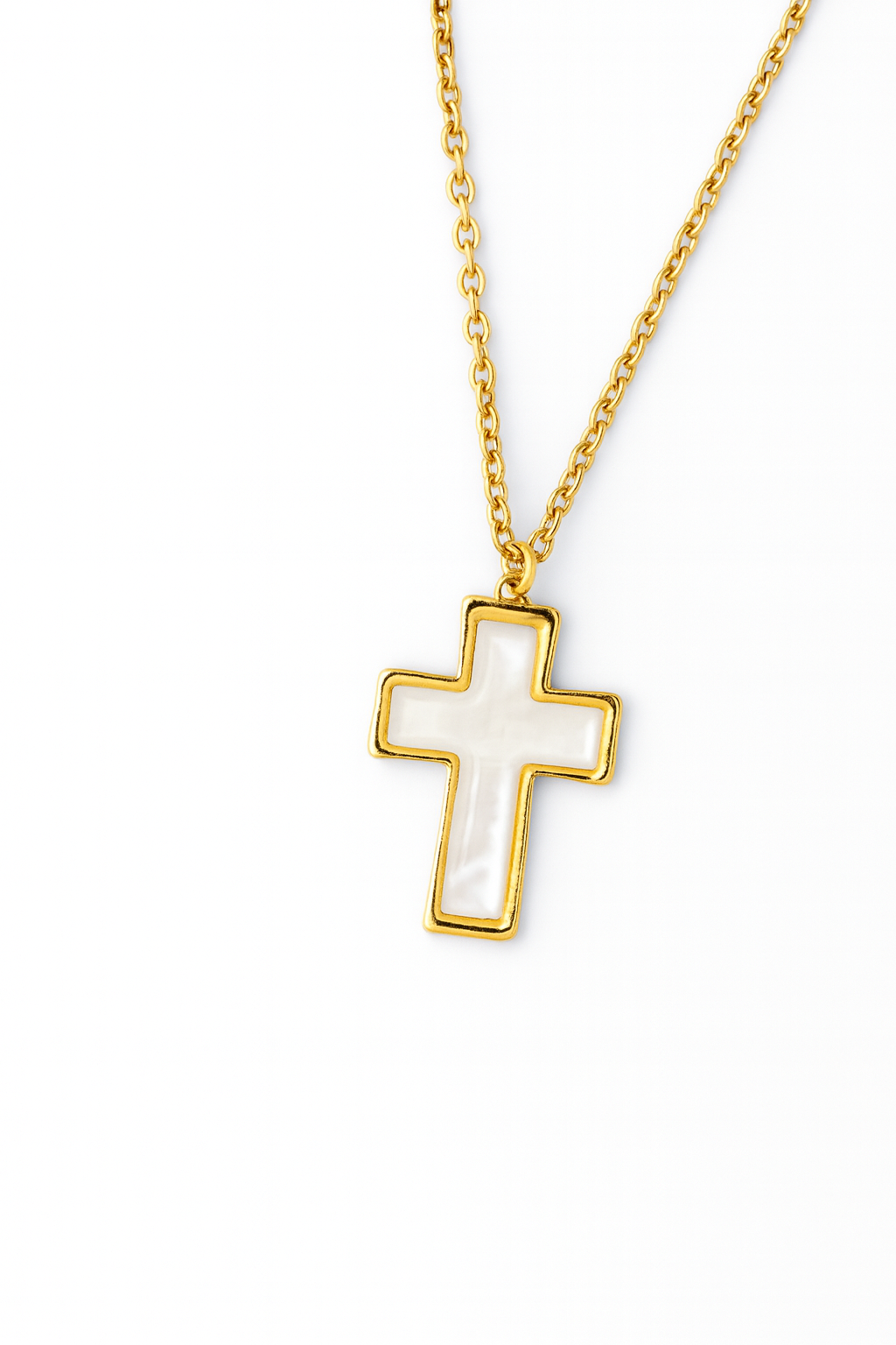 Cruz de acero inoxidable y nácar blanco. Ajustable.